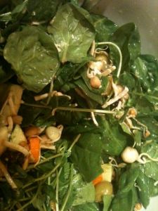 1 cup of mixed crunchy beans (I bought a bag of these fresh beans at a market the other day; this mix includes garbanzo and lentils and sprouts)